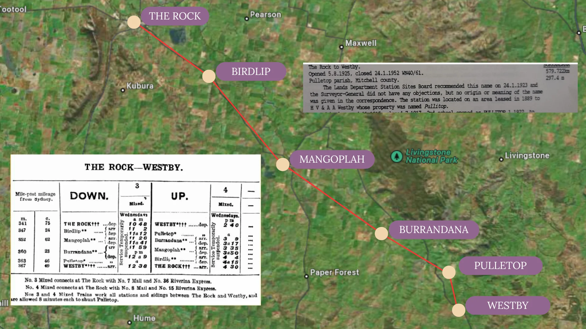 The N.S.W Railways Weekly Notice no. 31 – for the period Saturday, 1st August 2025 to Friday, 7th August, 1925 mentions the “Opening of the Extension from The Rock to Westby”. The line, under control of Junee DIstrict Superintendent was opened on Wednesday, 5th August 1925.
